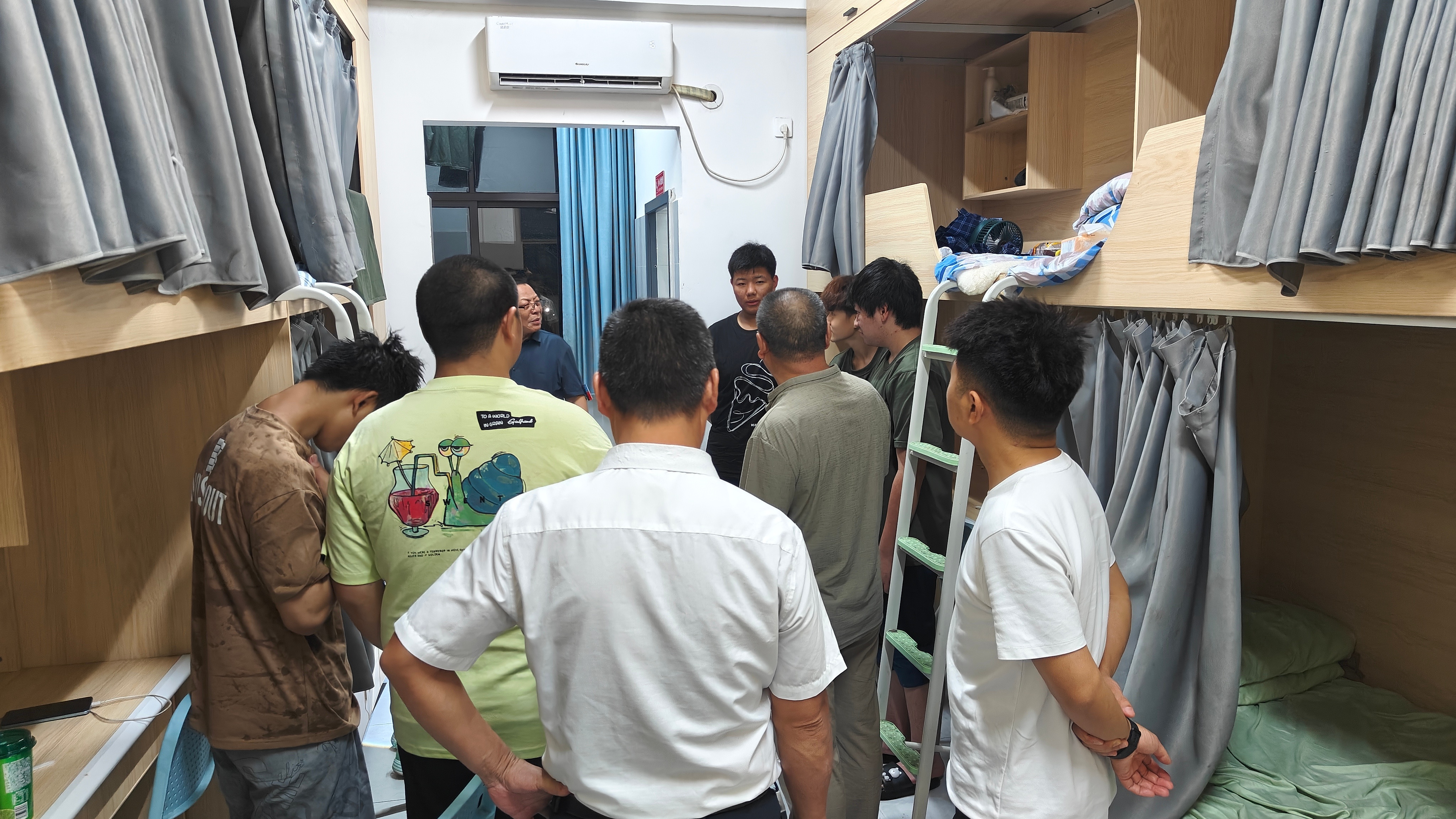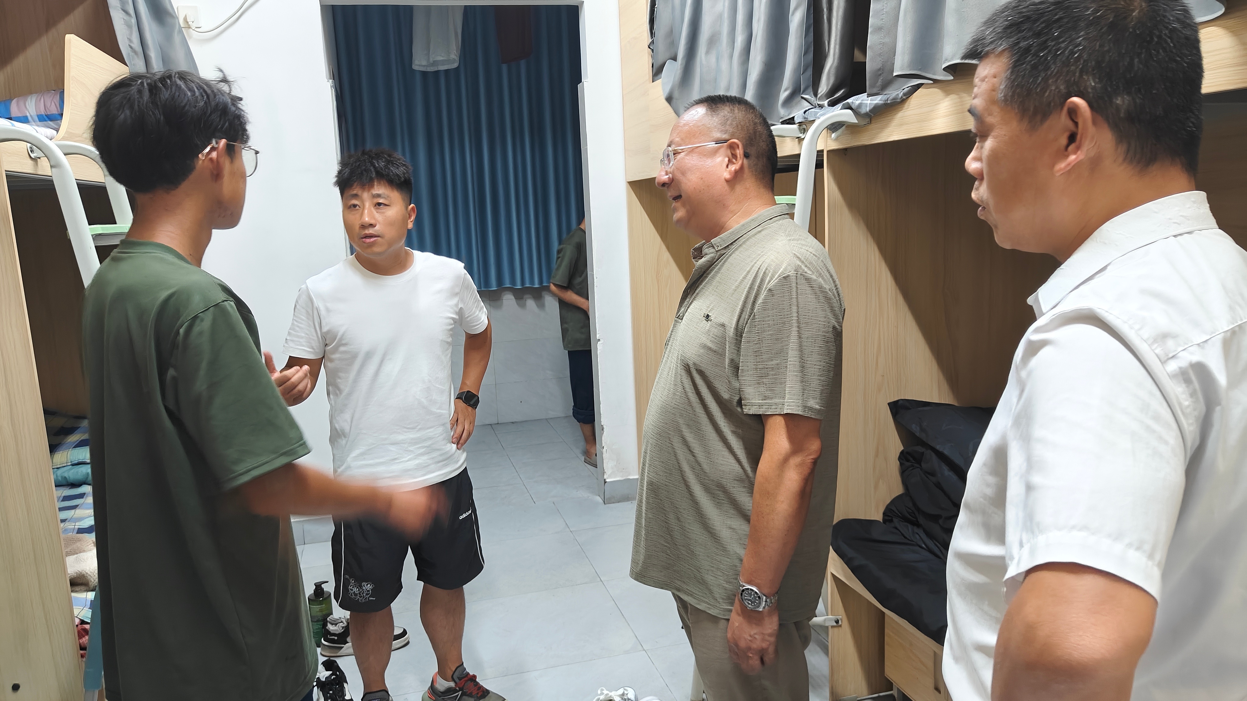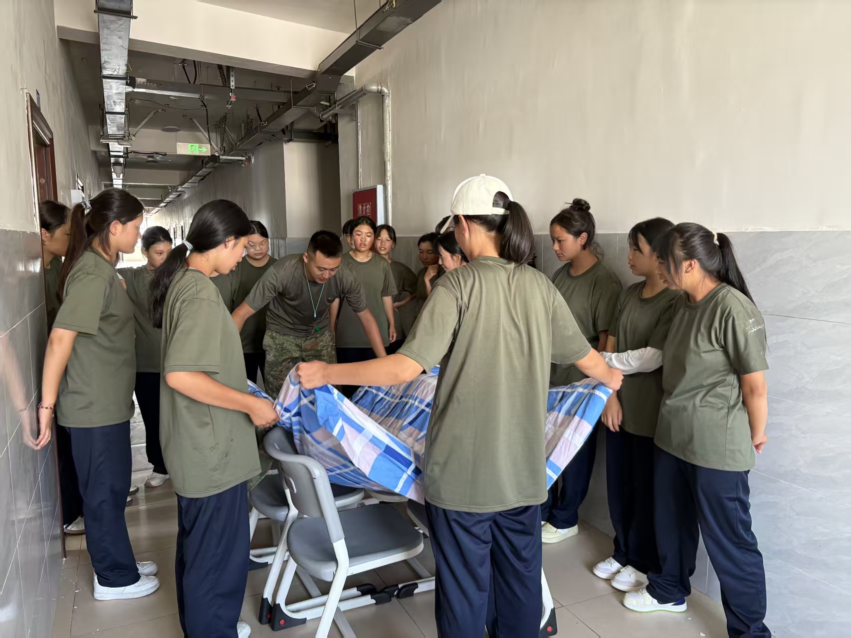 内务整理现场,教官手把手示范叠被:将被子平铺,先沿中线对折,手掌反复压出折痕;再捏边角上翻,指尖掐边捏出直角。片刻后,松散被子便成了方方正正的“豆腐块”。周围学生凑近围观,有人蹲在床边盯教官手势,不时小声问:“教官,折角要捏多紧呀?”