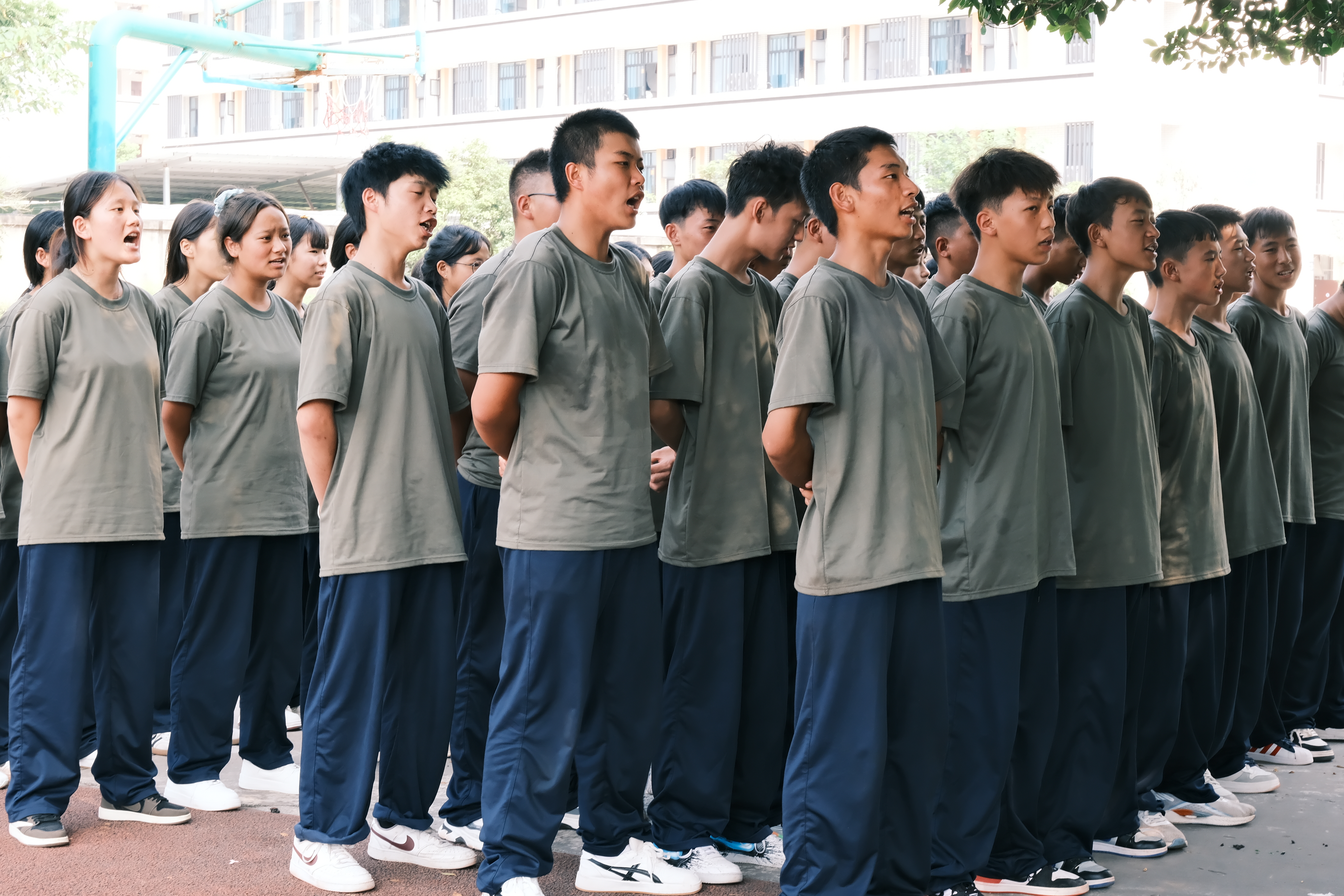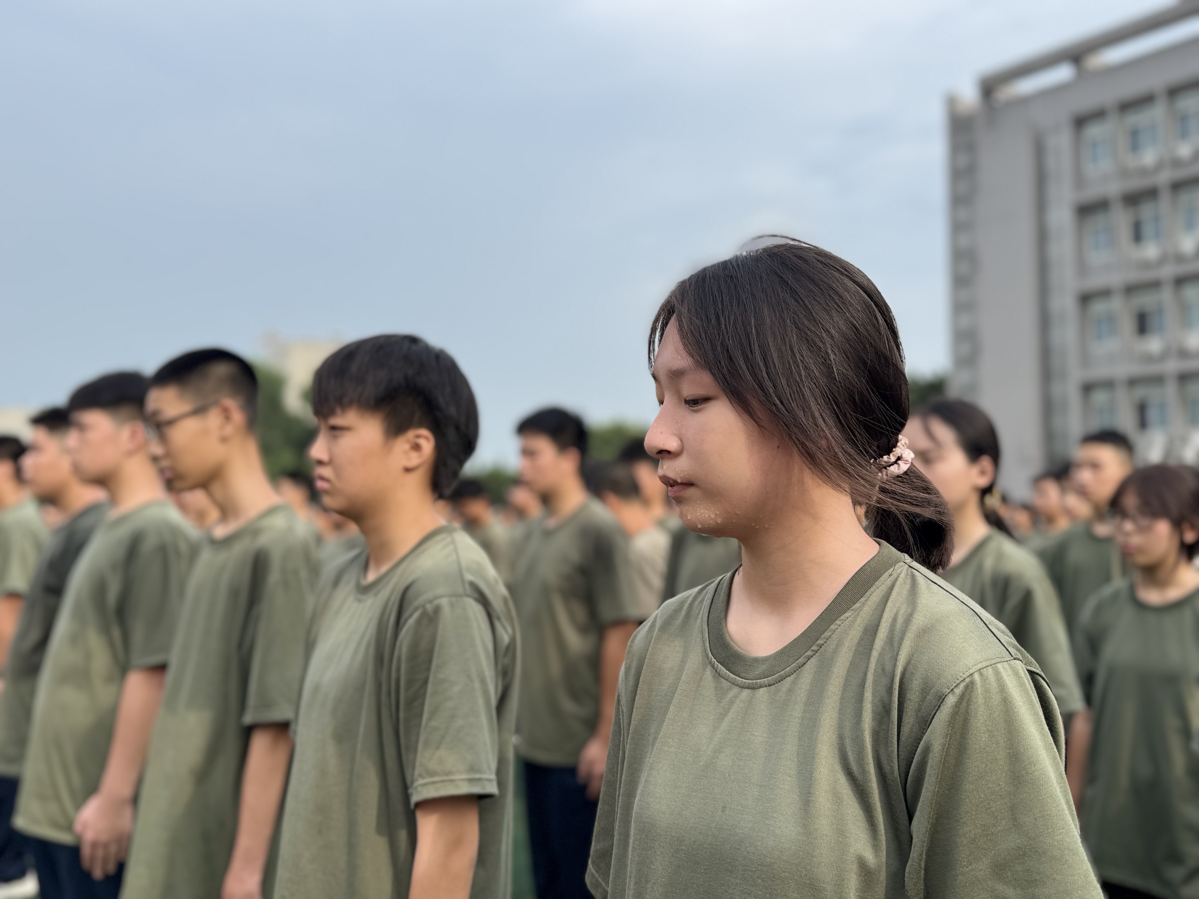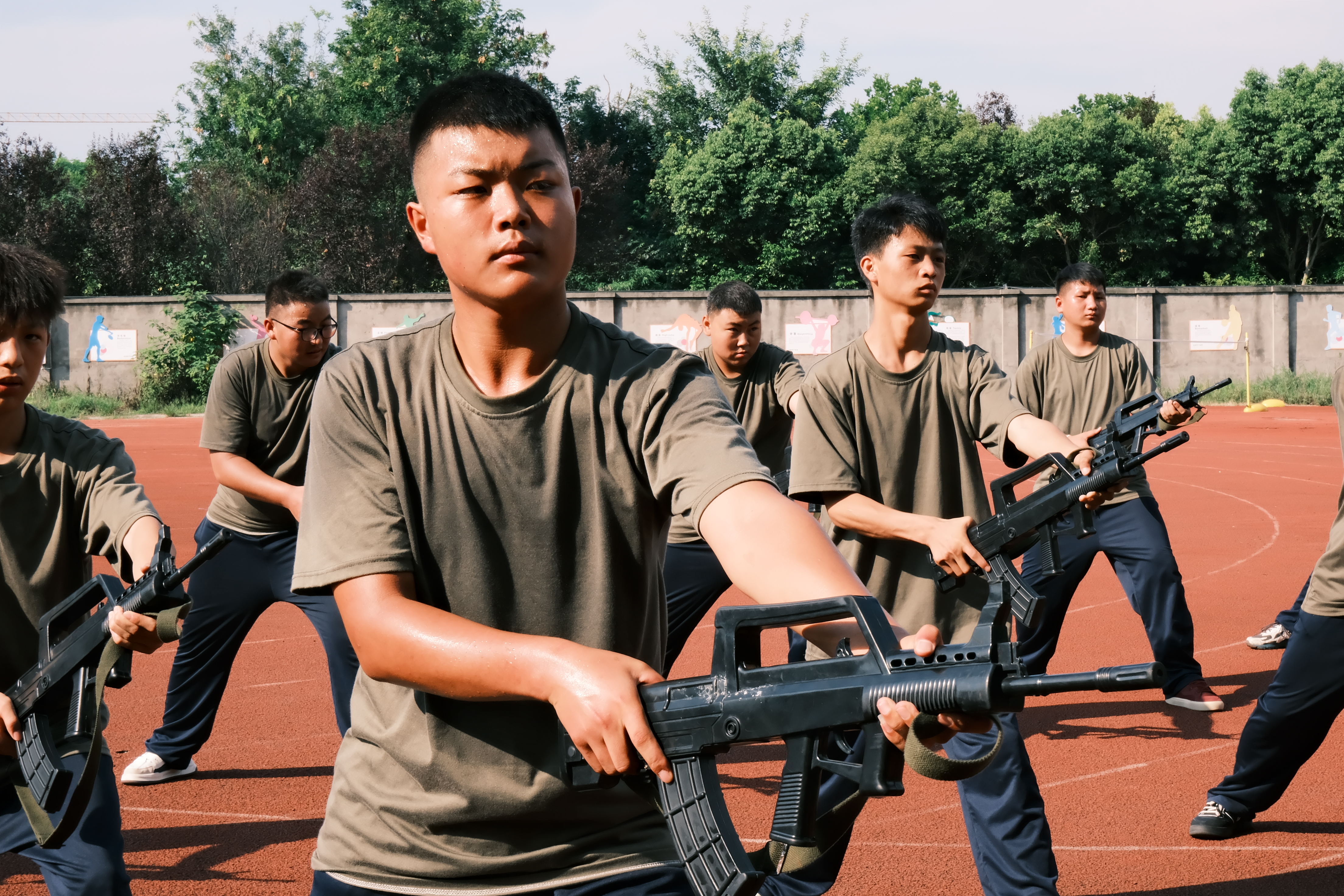 “稍息!立正!” 随着教官一声令下,新生们迅速调整站姿,阳光在脸上投下斑驳光影,汗水顺着脖颈滑落浸湿校服,却没有一人随意擦拭。