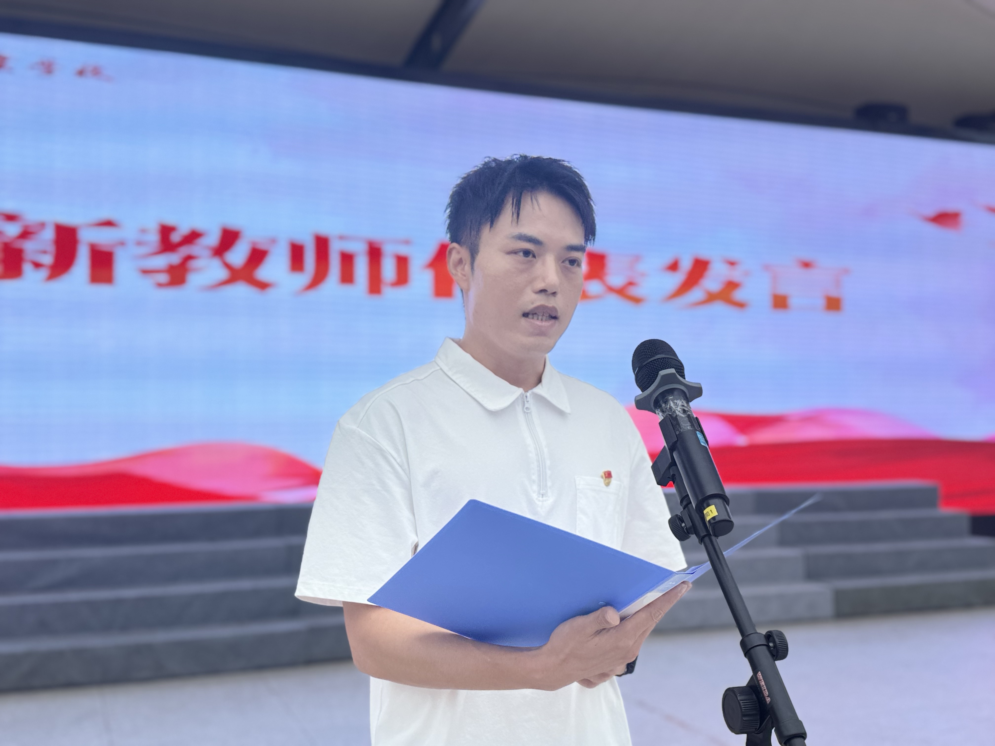 新教师代表罗磊以饱满的热情作了表态发言。他立下“躬耕教坛、强国有我”的志向,承诺将以身作则、恪守师德,做学生成长路上的灯塔与舵手。他的话语中充满了对教育事业的敬畏与对未来的憧憬,展现了新一代青年教师的责任担当与昂扬风貌。