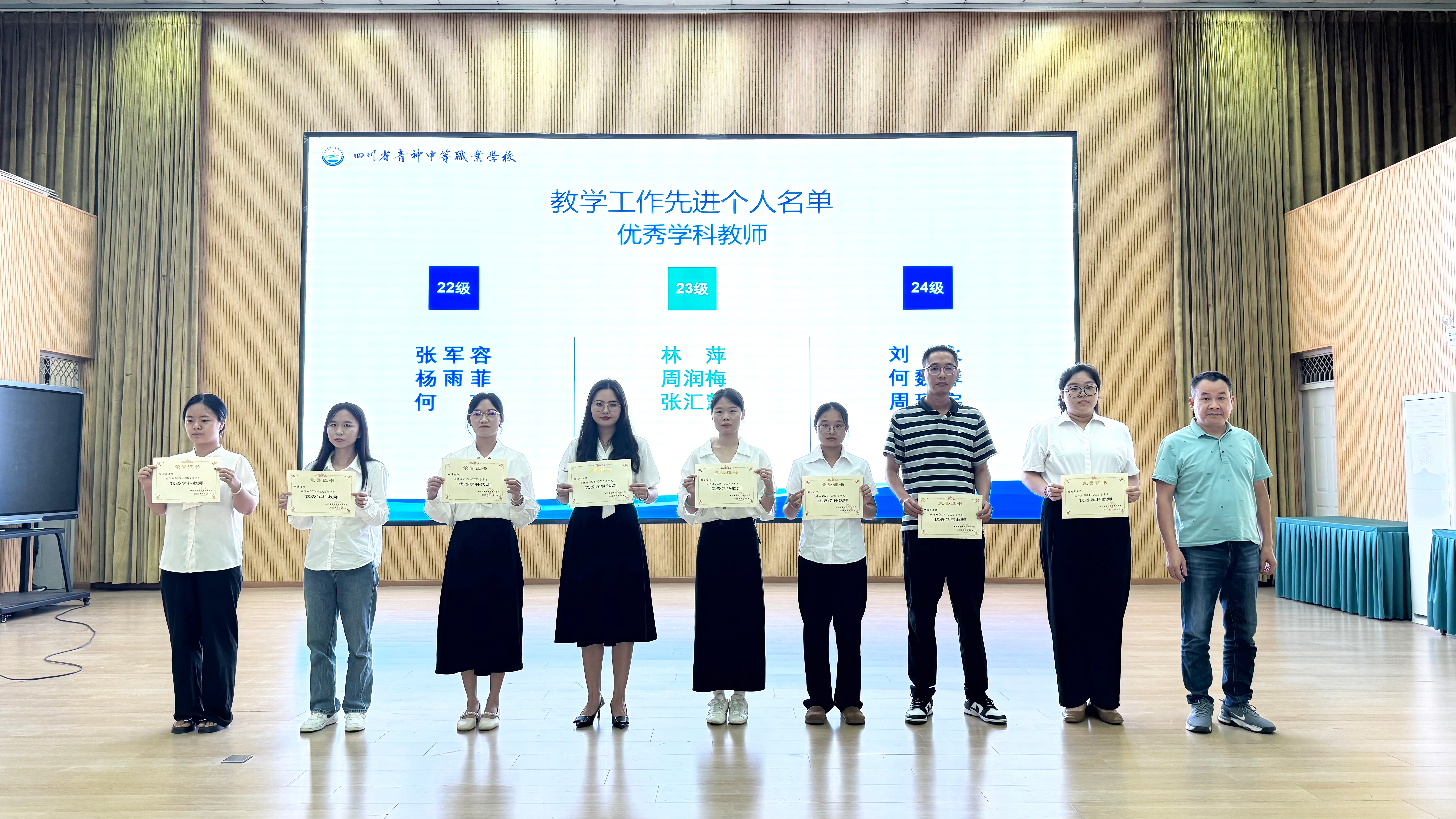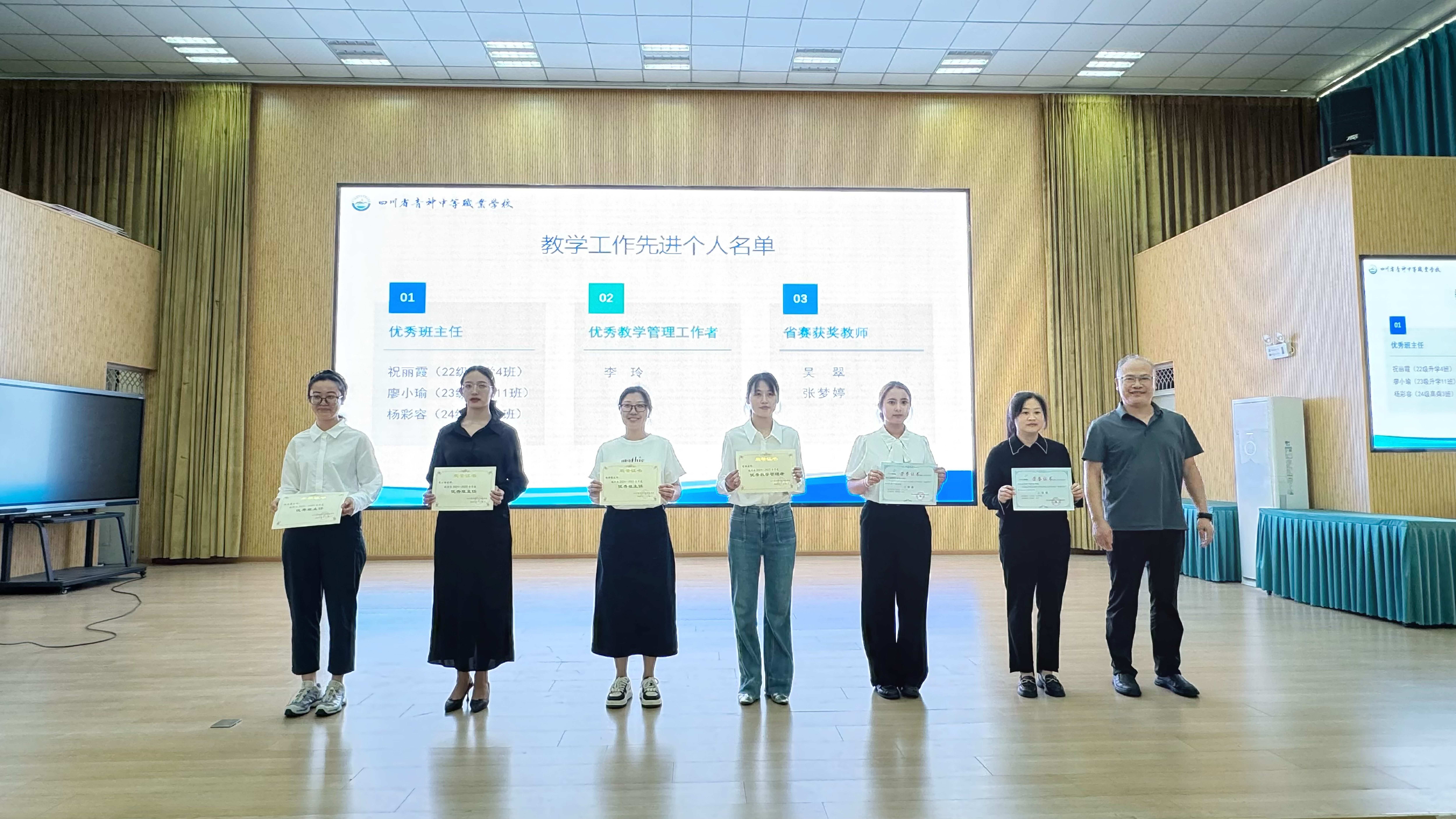 在表扬先进环节,副校长傅成均宣读《四川省青神中等职业学校关于表扬2024-2025学年度教学工作先进个人的通报》。随后,贾志文主任为优秀学科教师颁奖,辜志华副局长为优秀班主任、优秀教学管理者及省赛获奖教师颁奖。