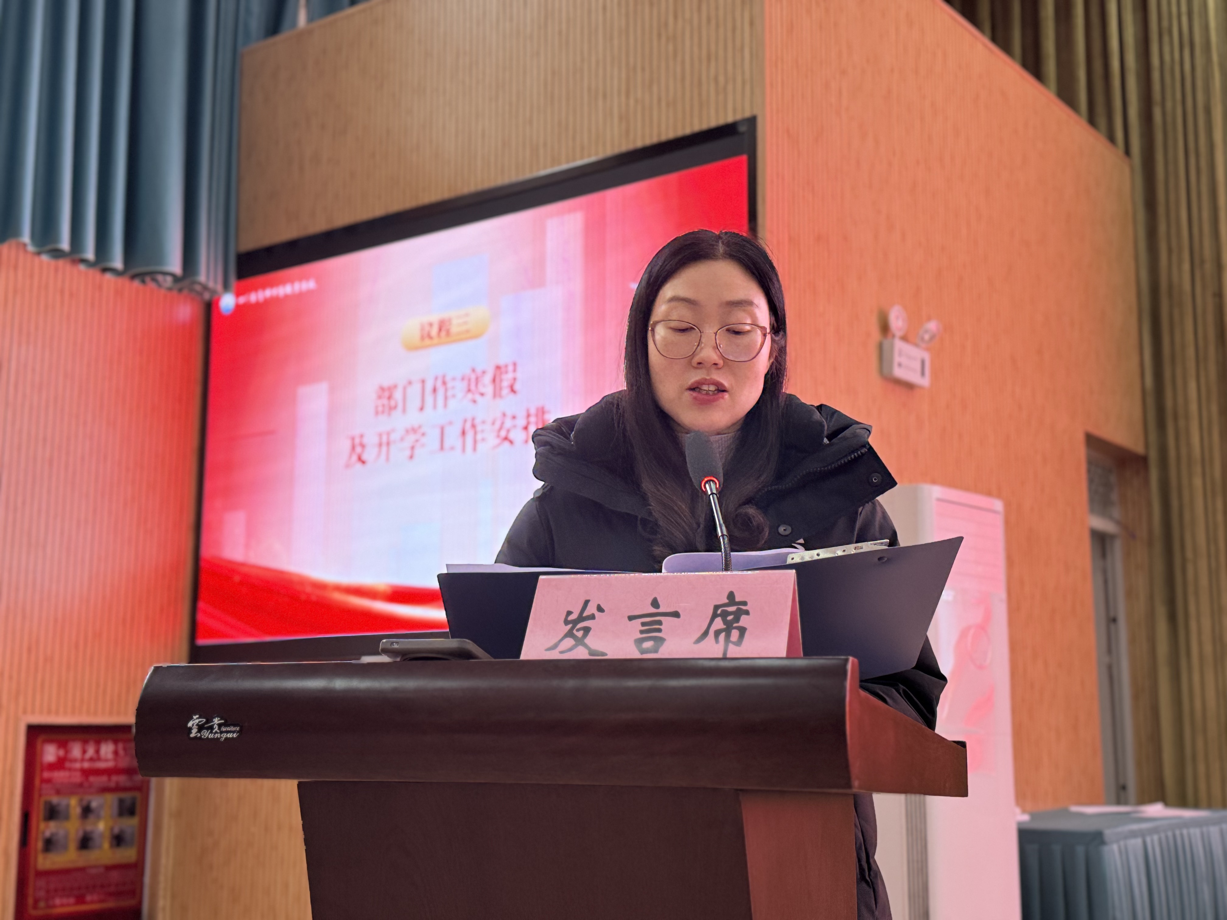 学校党支部副书记张军容就寒假假期工作作出全面部署,她围绕师生安全保障、假期规范管理、开学筹备衔接三大核心,提出明确要求:一是筑牢假期安全防线;二是严格落实假期值守制度,要求值班人员坚守岗位、履职尽责;三是统筹推进开学筹备,为新学期平稳有序开学奠定坚实基础。