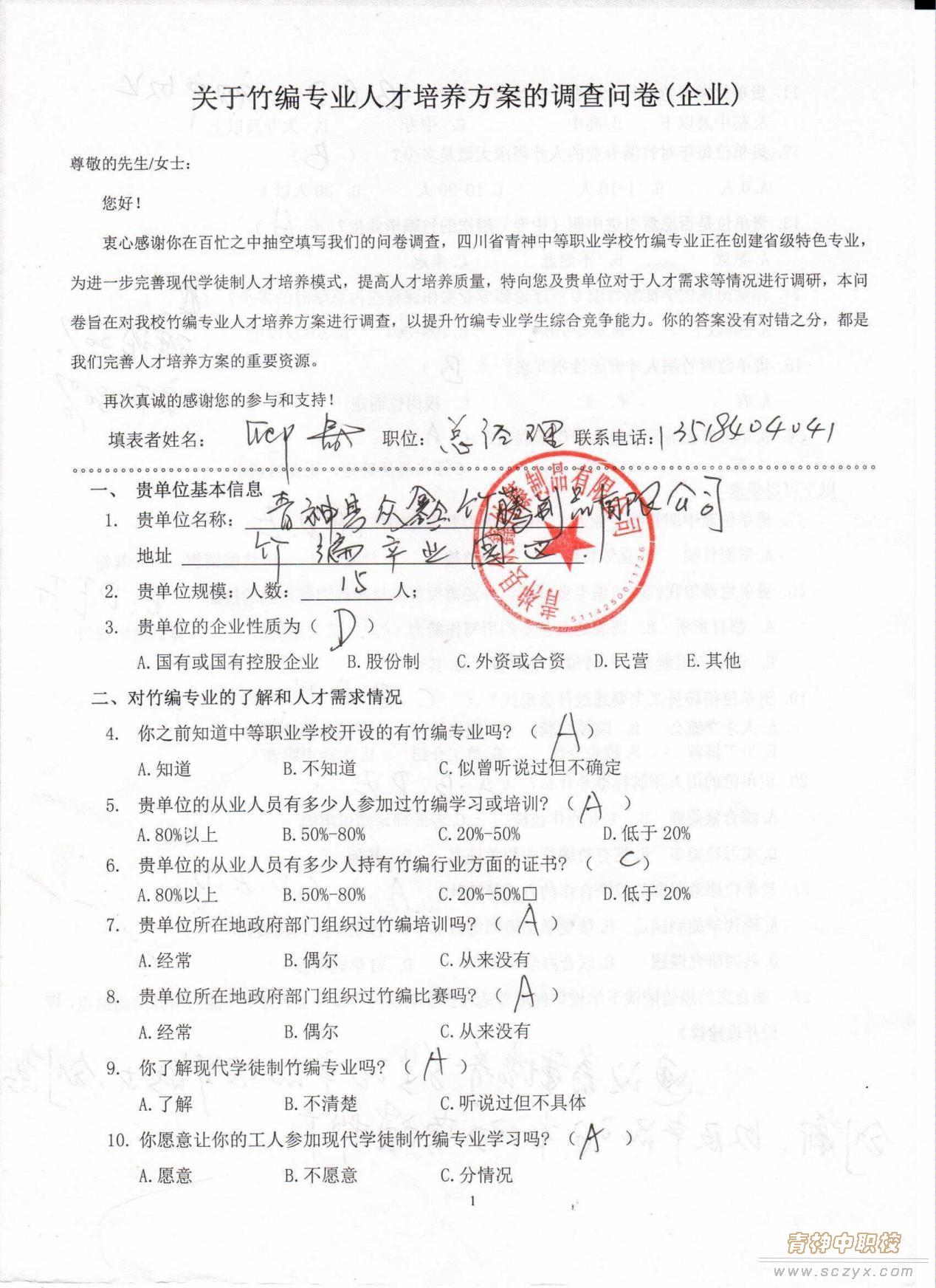 竹编专业人才培养方案调查问卷(企业)